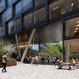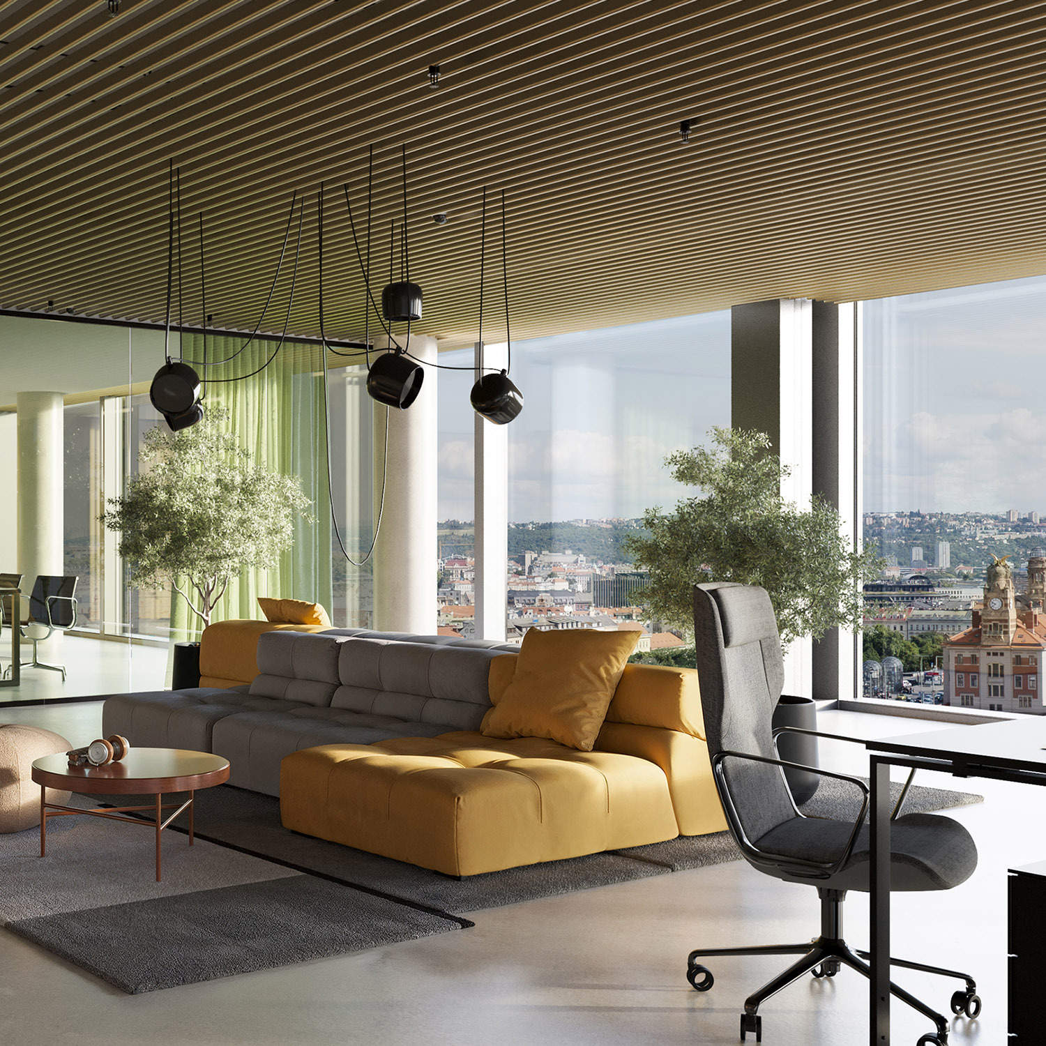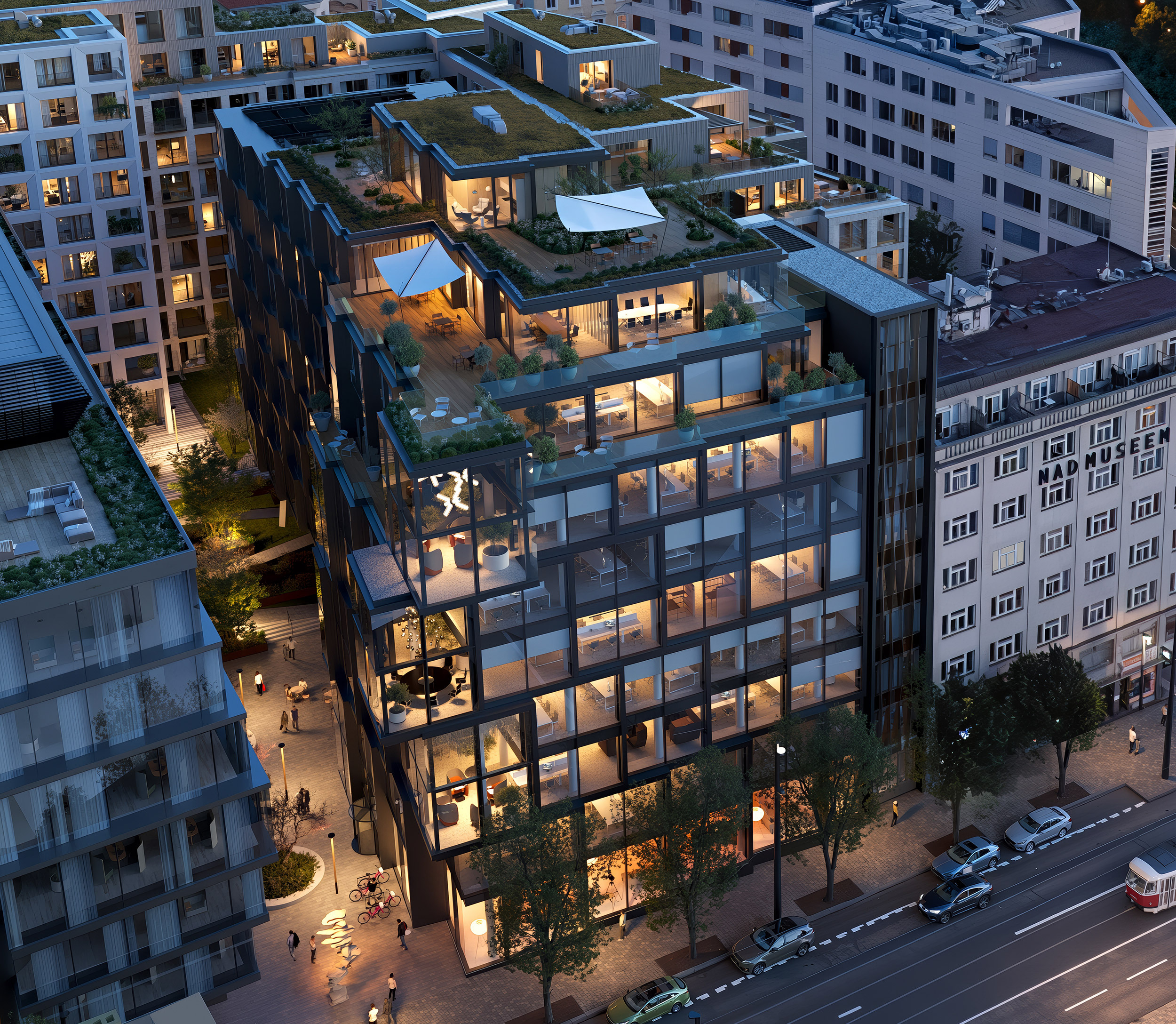 Workplace wellbeing is further enhanced by a shared rooftop terrace with views over Prague, providing space for informal meetings, short breaks, or corporate events. A lively ground floor with services, cafés, and gastronomy naturally extends the office environment into the city, fostering balance between work, interaction, and the everyday rhythm of urban life.