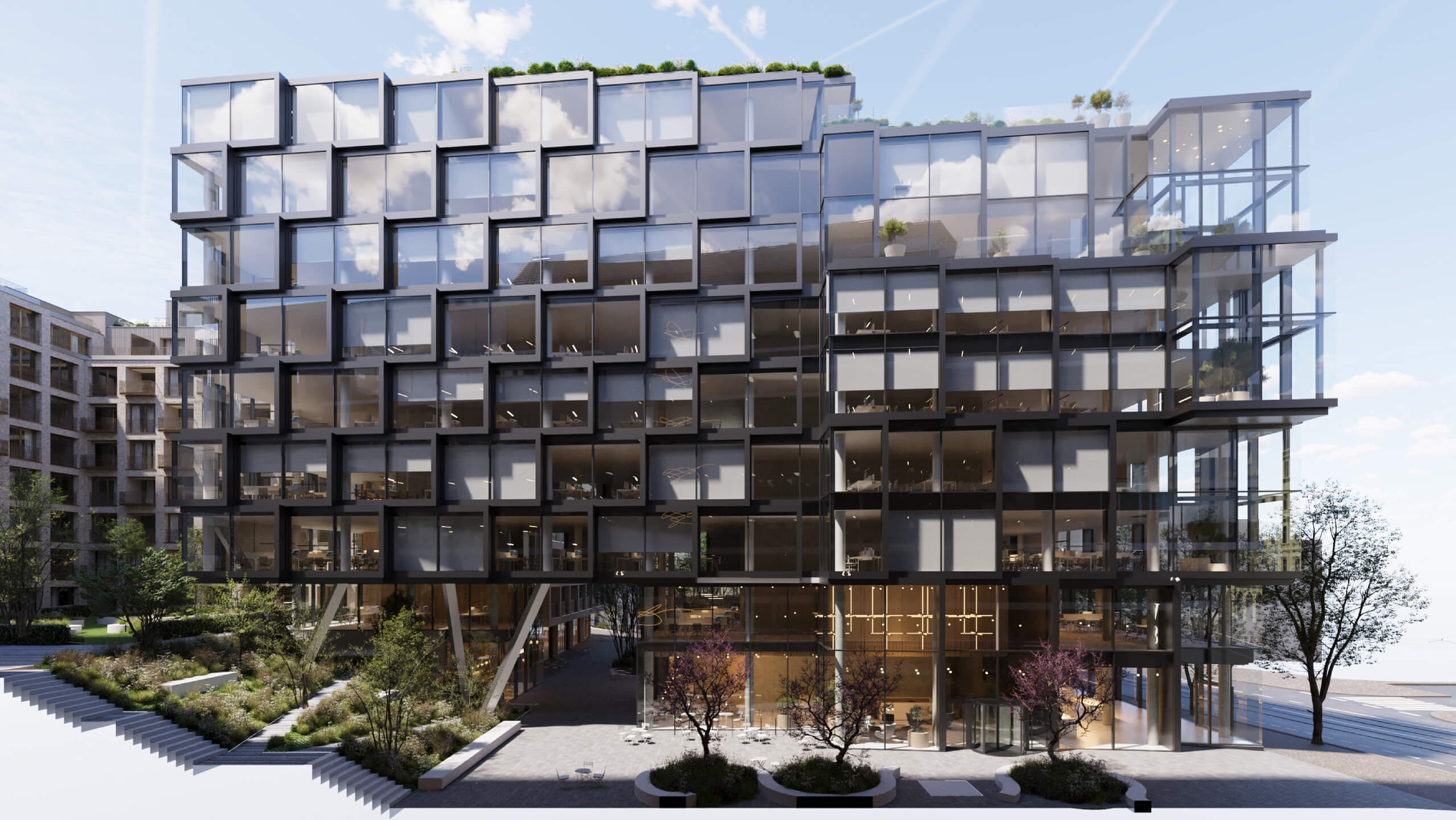 K dispozici bude 7 500 m² kancelářských prostor nejvyššího standardu a přibližně 1 400 m² obchodních jednotek v parteru, jež se stanou přirozeným centrem života a energie celého komplexu. Nedílnou součástí je také rezidenční část s nabídkou výjimečných bytů a penthousů, které rozšiřují hodnotu projektu o luxusní bydlení i atraktivní investiční příležitost. Vnitřní atrium se zelení a odpočinkovými zónami dodává celku rovnováhu mezi prací, životem a relaxací.